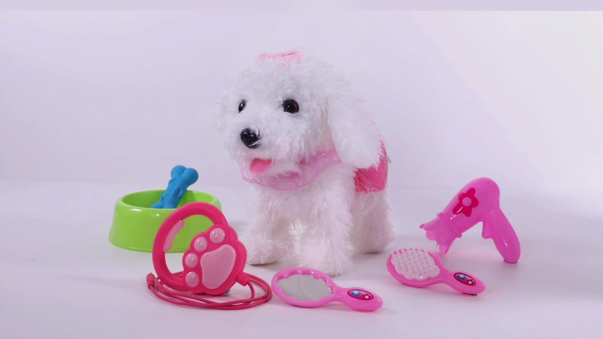 【ELECTRONIC PLUSH PET PUPPY FOR KIDS】- The adorable electric plush toy puppy is approximately 9" tall,the best companion to have around children.Includes 1*plush electronic interactive pet dog, 1*remote control leash, 1*comb, 1*hairdryer, 1*mirror, also attached with a bowl & soft rubber bone for pretend pet dog in feeding.